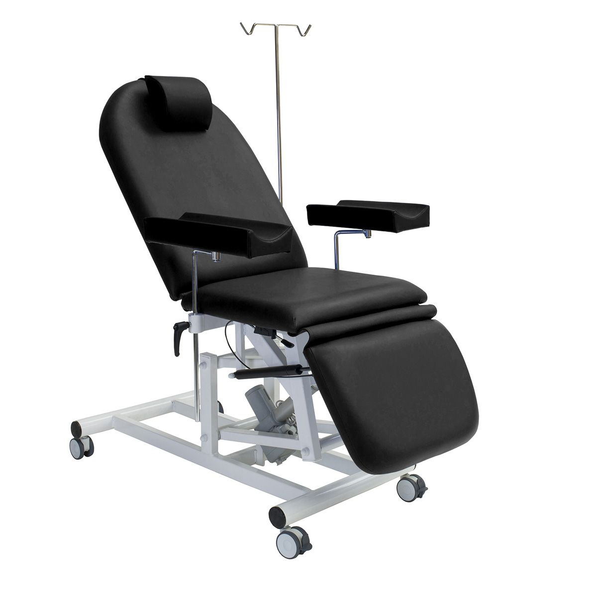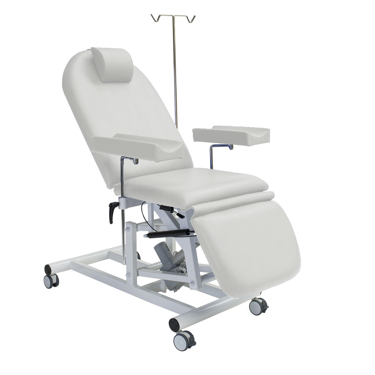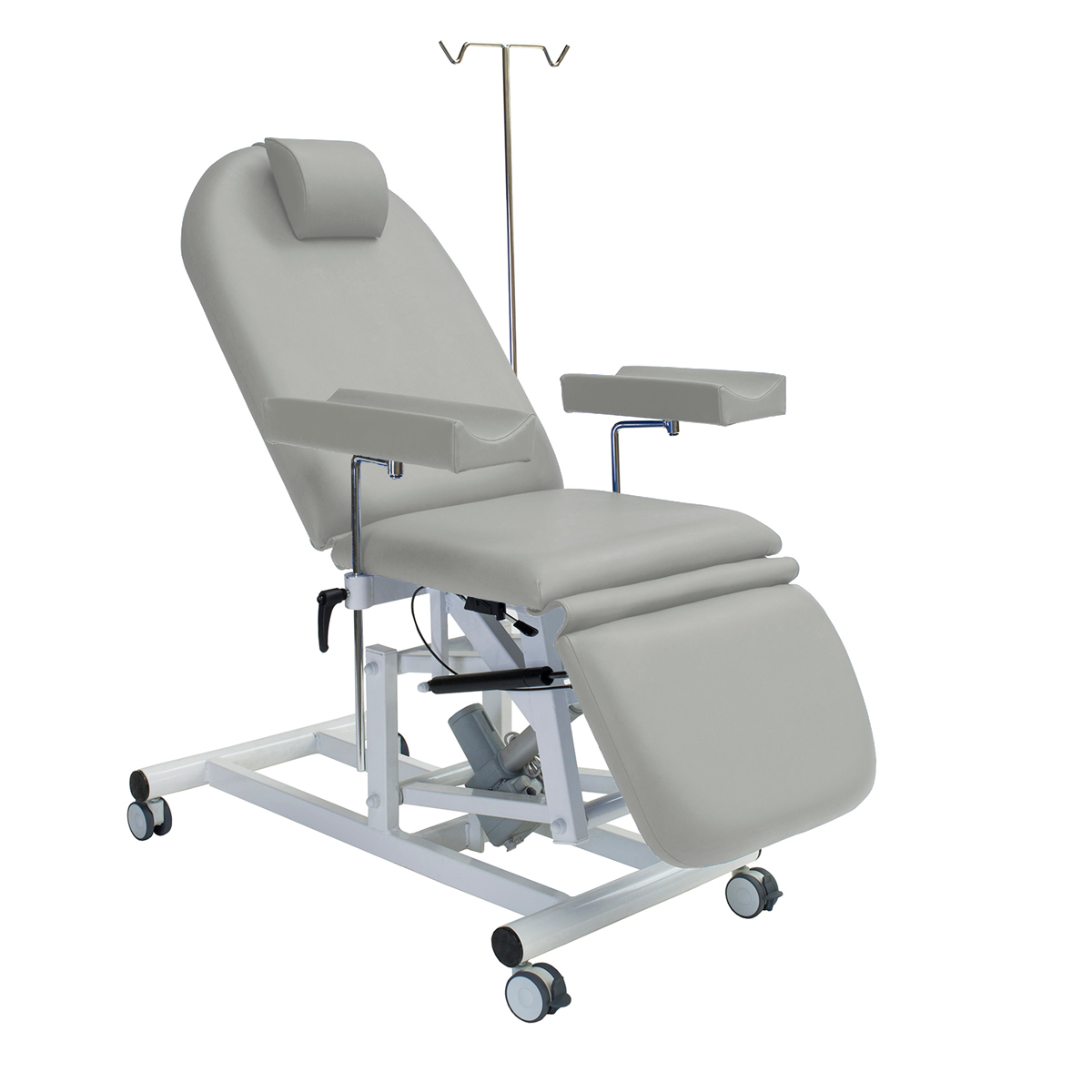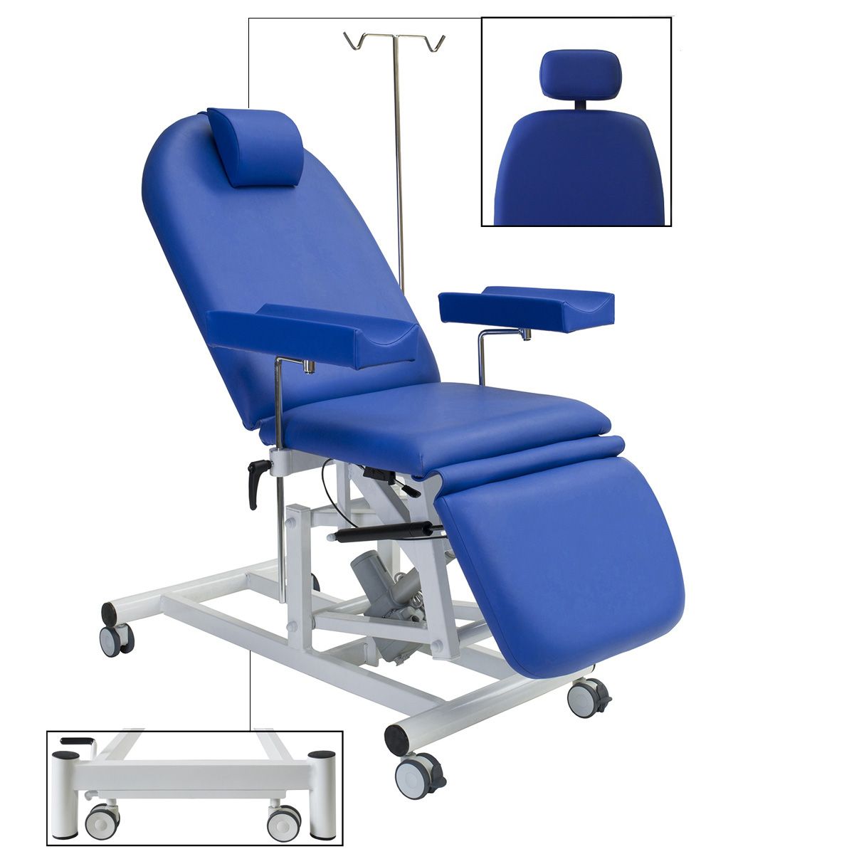 Gouttières de sang et tige porte sérum réglables en hauteur et pivotantes.