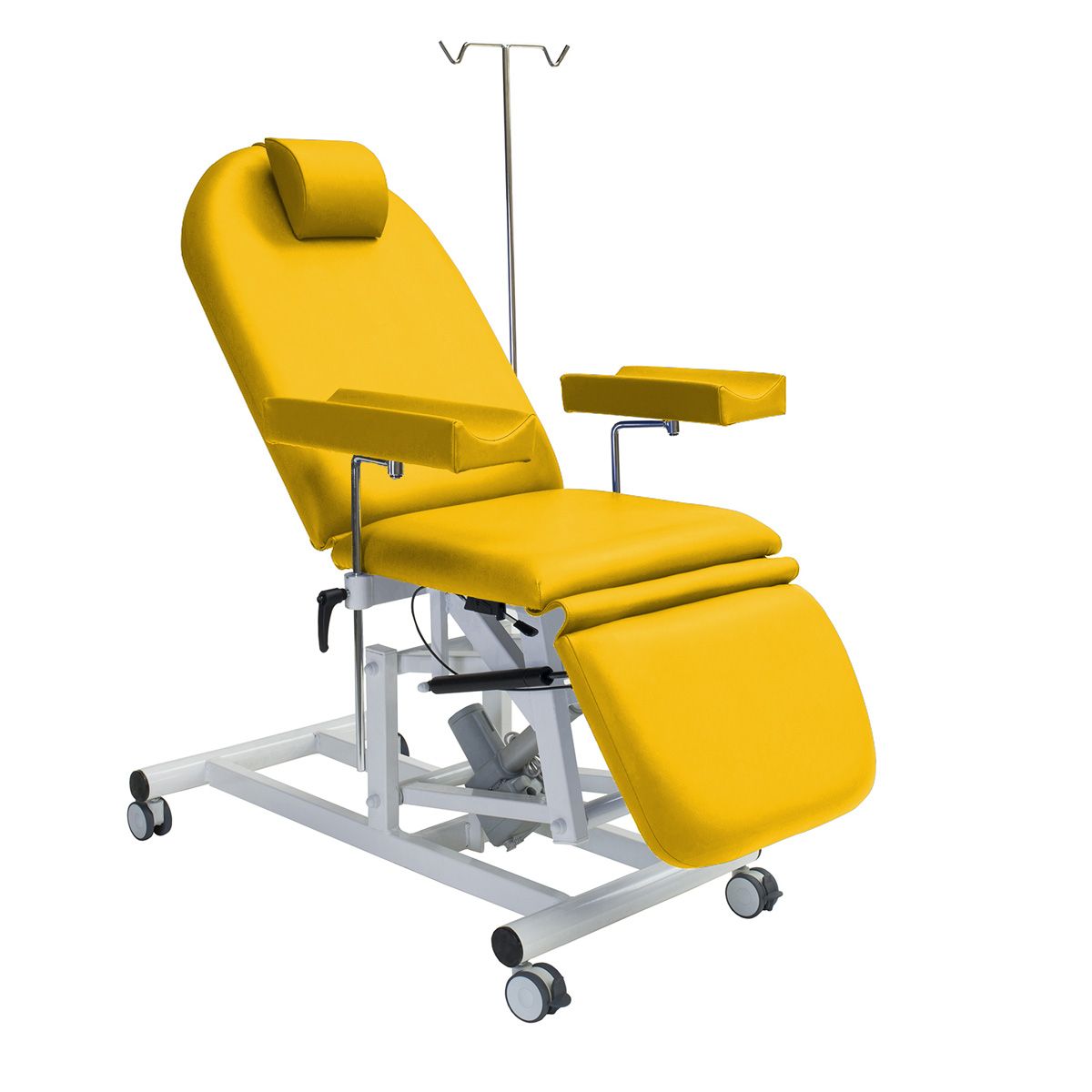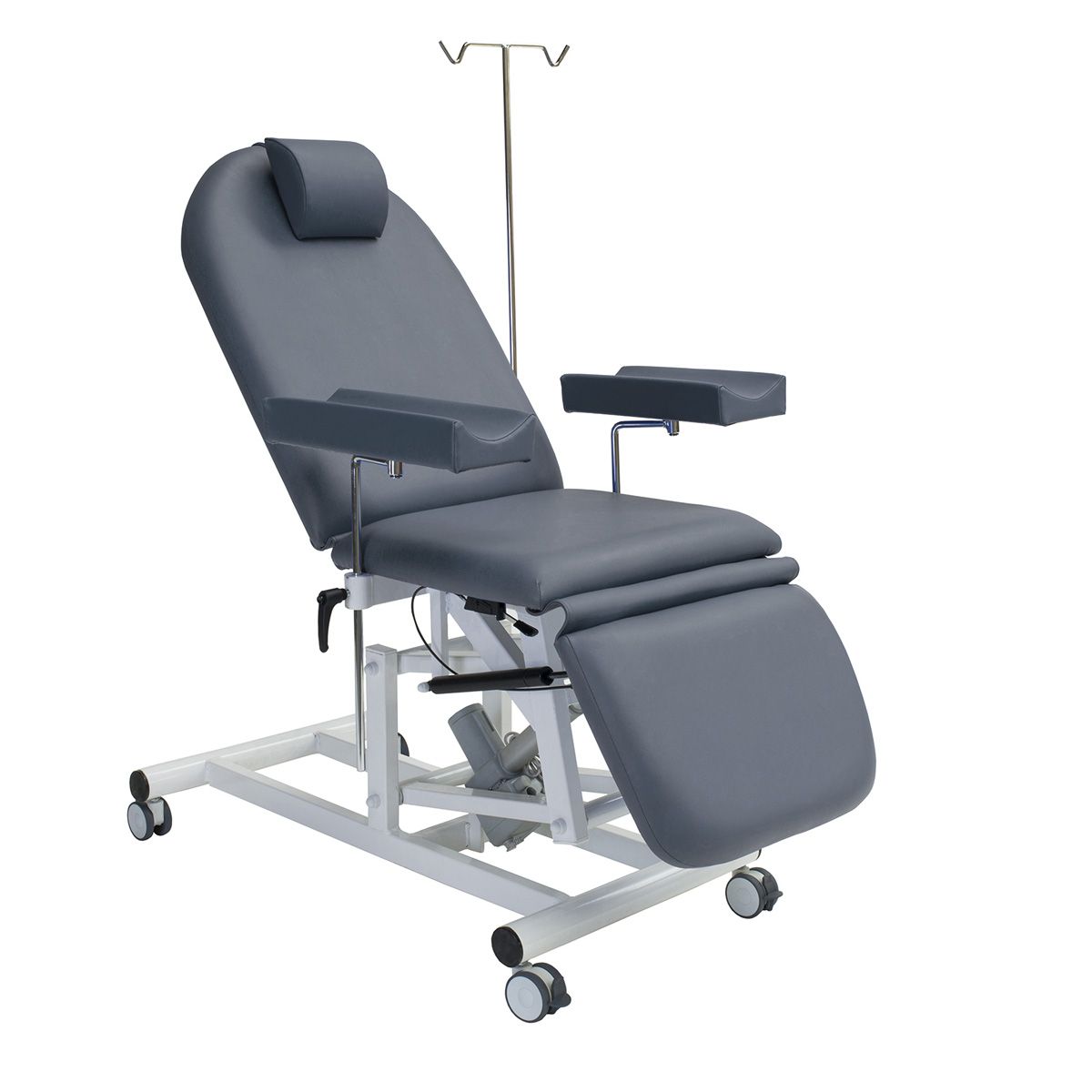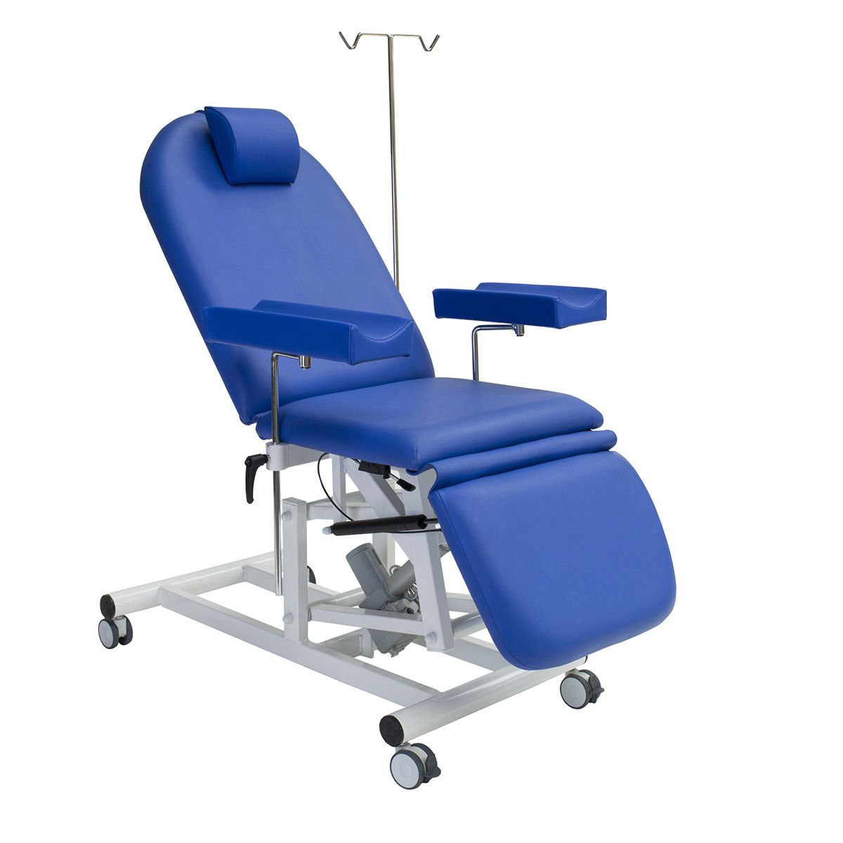 Gouttières de sang et tige porte sérum réglables en hauteur et pivotantes.
