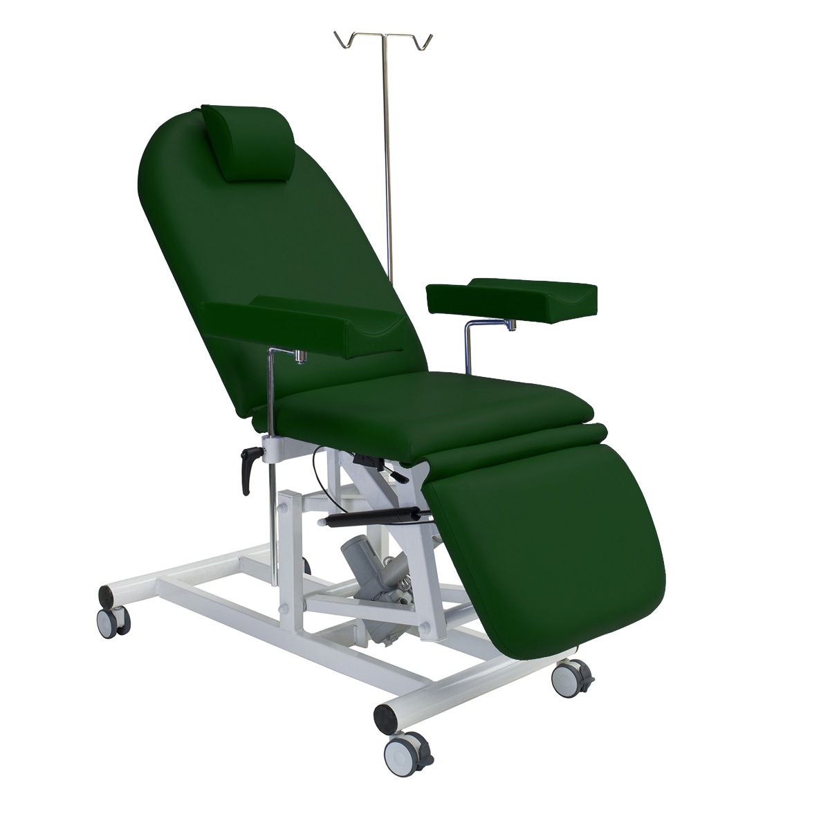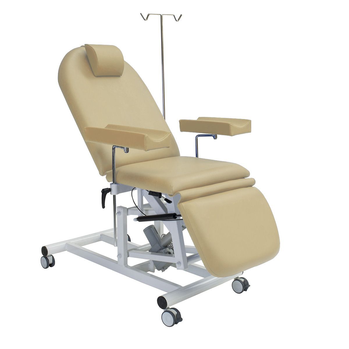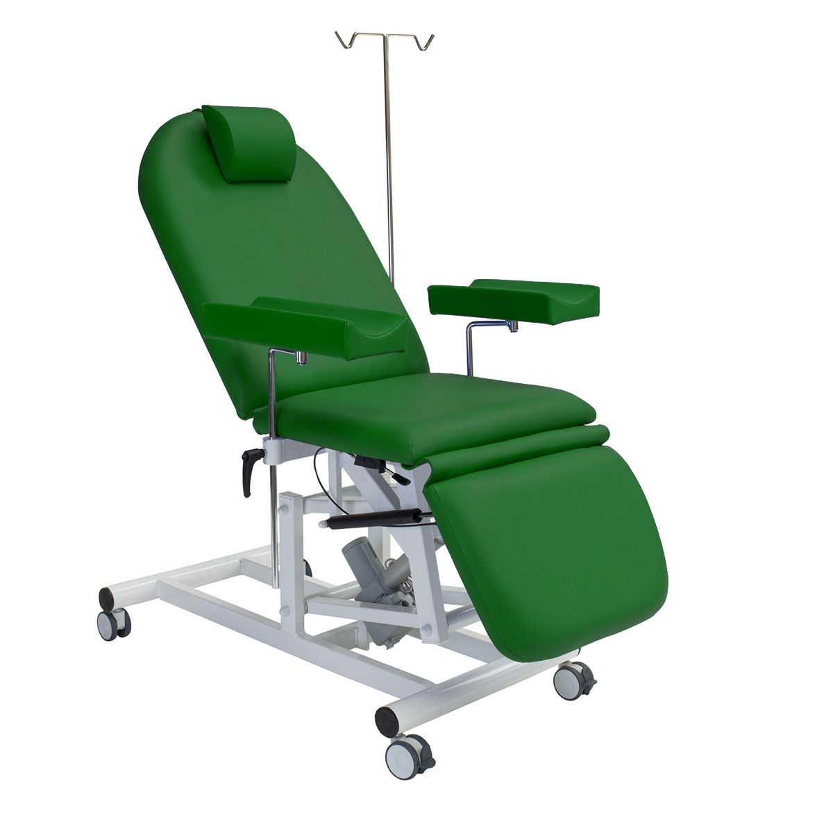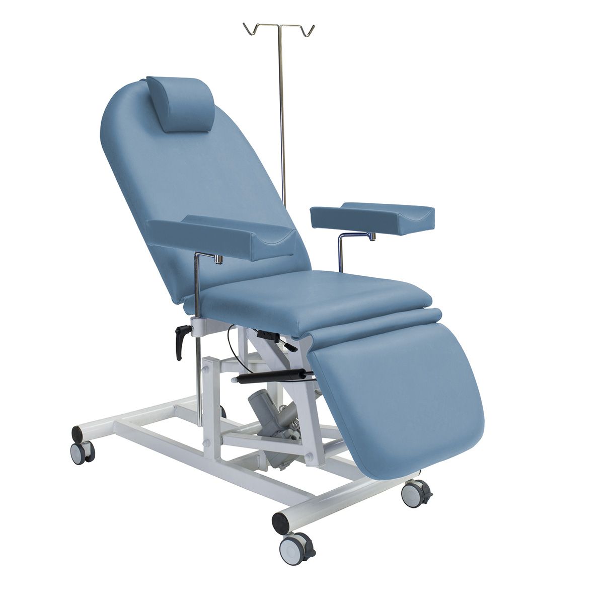 Gouttières de sang et tige porte sérum réglables en hauteur et pivotantes.